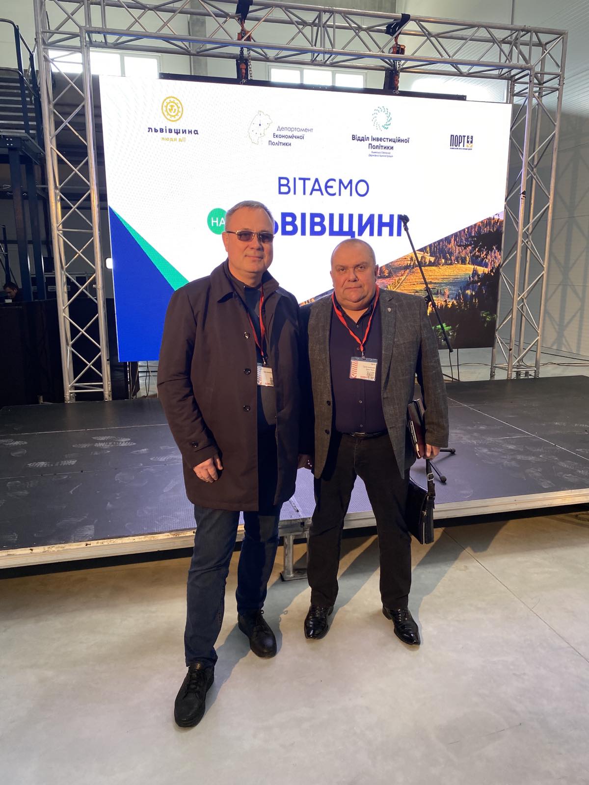 Президент групи компаній ДЕОС Реліз Олег Єпішин, голова спостережної ради ПП ДЕОС Охорона Олександр Скорняков та керівник відділу залучення інвестицій Львівської ОДА Орест Фільц під час проведення конференції релокованого бізнесу та місцевої влади 29.04.2022 року.